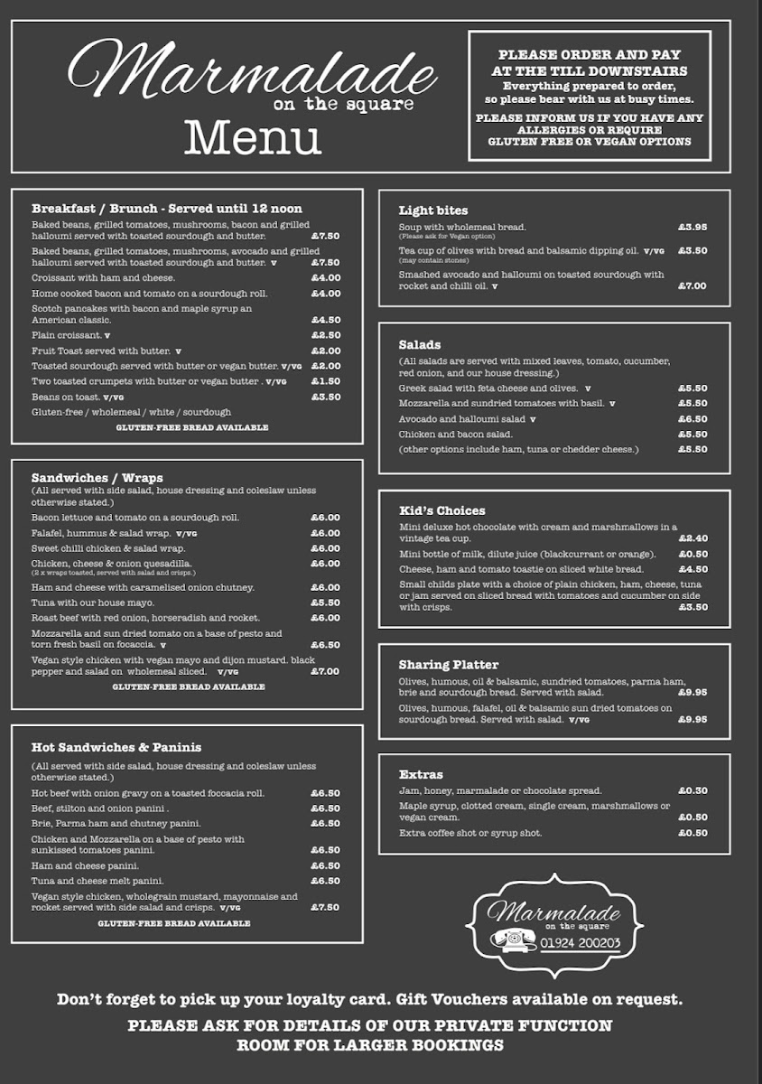 The menu at Marmalade on the Square offers a thoughtfully curated selection of café classics and casual bites, designed to feel both familiar and comforting. You’ll find a range of options perfect for relaxing breakfasts or light lunches, alongside indulgent cakes and warming hot drinks that suit quieter moments or friendly catch-ups.